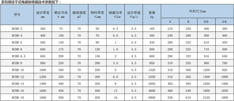 產(chǎn)品介紹:RCDB型自冷盤(pán)式電磁除鐵器與PDC系列盤(pán)式電磁除鐵器、RCDY系列電磁除鐵器等同。是用于清除粉狀或塊狀非磁性物料中雜鐵的除鐵裝置。其內(nèi)部采用電工專(zhuān)用樹(shù)脂澆注,自冷式全密封結(jié)構(gòu),具有透磁深度大、吸力強(qiáng)、防塵、防雨、耐腐蝕等特點(diǎn),在極其惡劣的環(huán)境中仍能可靠運(yùn)行。