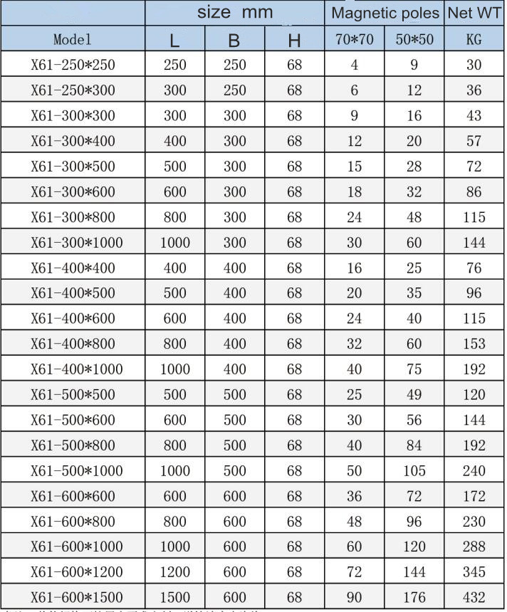 Requirements for use: The thickness of workpiece should be more than 10MM. The most suitable condition for holding the workpiece is at least four contacts of magnetic poles. With the use of magnetic conducting soft claws and sliding projectiles, more functional workpieces can be processed, such as five-sided processing, drilling, tapping, milling grooves, etc. Complete the processing procedure at one time, irregular and surface bending workpiece can also clamp processing.